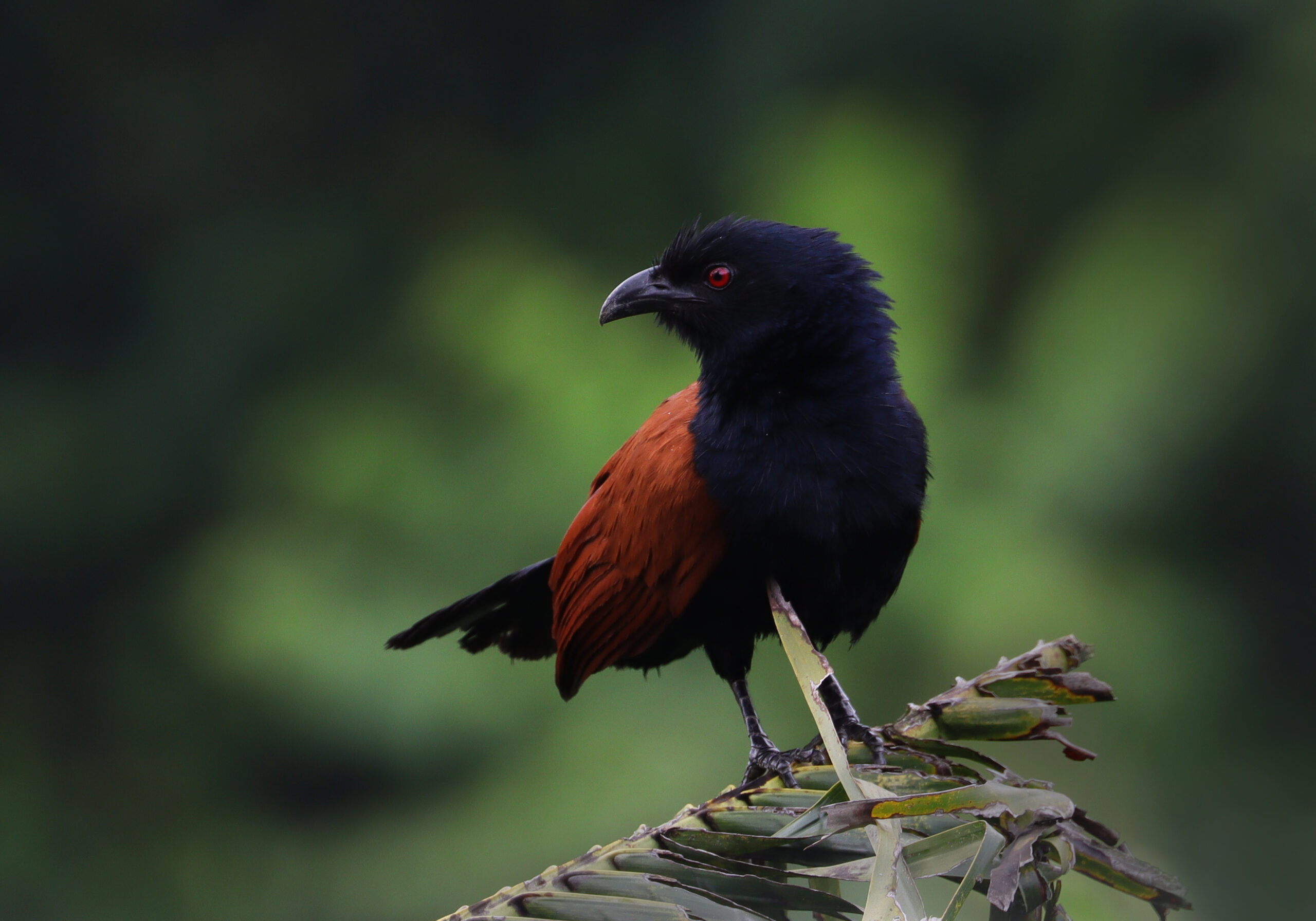 Coucals are medium- to large-sized birds characterized by long, broad tails, strong legs, and relatively heavy bodies. Their plumage often features contrasting colors, such as glossy black bodies combined with chestnut or rufous wings. The eyes are frequently reddish, giving them a distinctive appearance. They have zygodactyl feet, adapted for climbing and moving through dense vegetation.